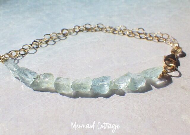 透明感のある美しいアクアマリンのラフロックと14ゴールドフィルドチェーンが半分づつのナチュラルでビーチイなハーフ&ハーフブレスレットは如何でしょう