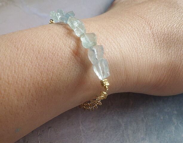 ブレスレットの半分にラフロックのアクアマリンを贅沢に連ね、もう片方を平打ちの14カラットゴールドフィルドのチェーンを2連にした大人っぽく優美なデザインです。テクスチャーのある平打ちのゴールドチェーンがキラキラっと輝き味があり高級感を加味しています