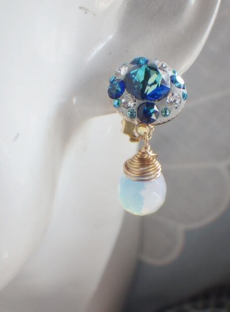 深いブルーの深海を思わせるバミューダブルーに綺麗なオパライトが映えるイヤリングです