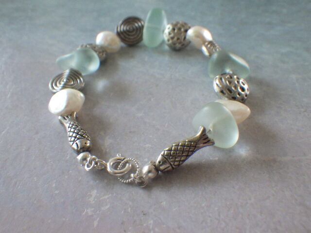 海を感じさせるシーグラスビーズと大粒の美しい淡水パールにアマゾナイトと波の渦巻きモチーフや海の生き物モチーフ、お魚を合わせて