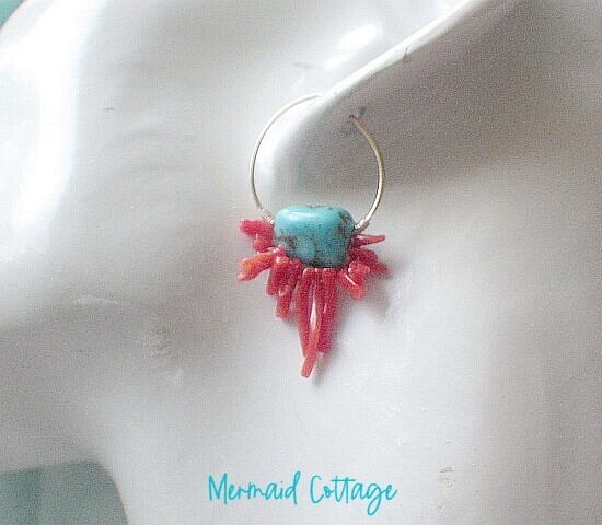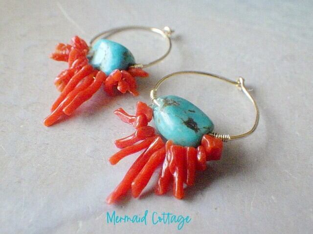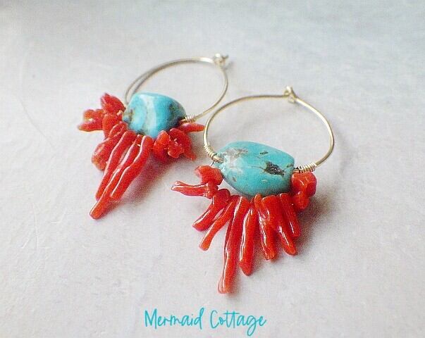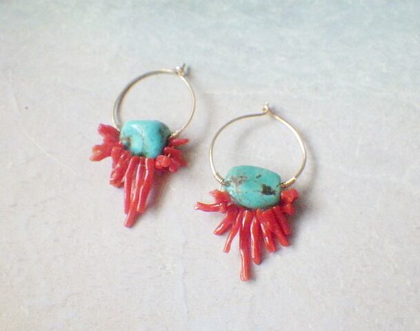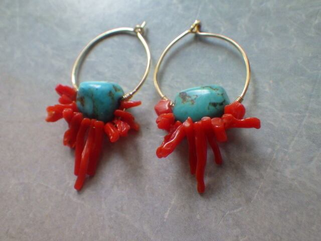 天然の赤珊瑚の枝とターコイズのビーチィでインパクト大のゴールドフープピアスな如何?