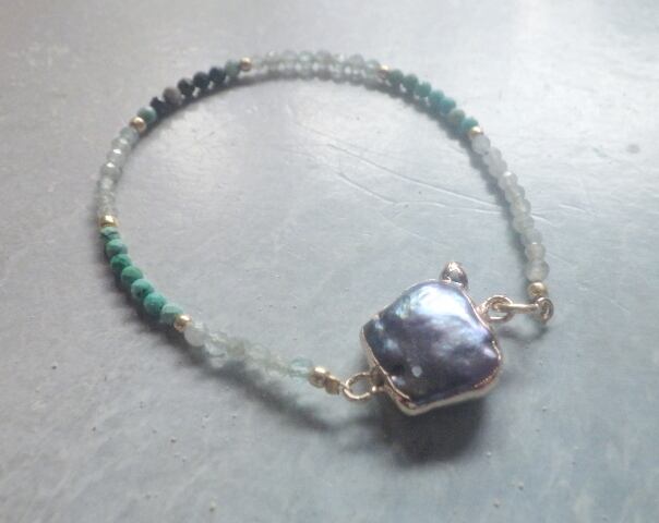 ブルーグレーに輝く黒蝶色の淡水パールにあわせ、ターコイズとアパタイト、アクアマリン、クリソコラを並べて海の色の天然石ブレスレットにしました