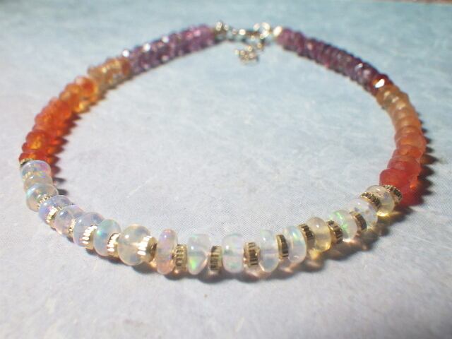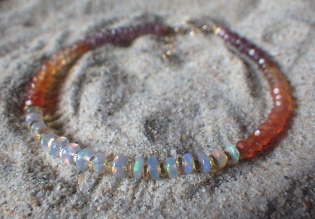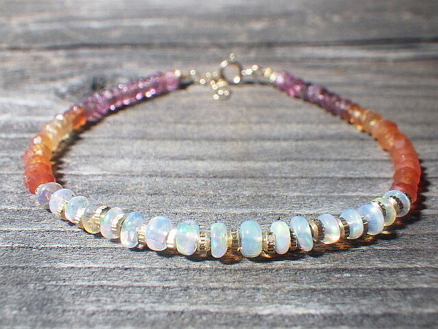 とーても美しい夕日色のカーネリアンとピンクトルマリンにオパールが輝くブレスレットです