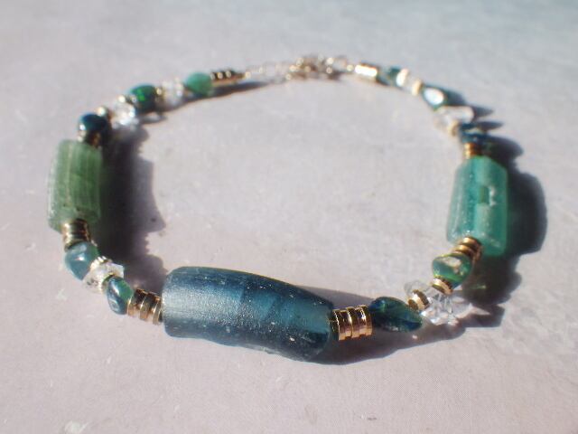 様々な青のローマングラスとブラックオパールをふんだんに使った、蒼が織りなす美しいブレスレットです