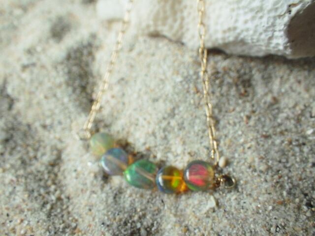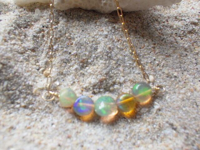 5粒のオパールが並ぶ華奢でフェミニンな14kGF(ゴールドフィルド)のネックレスです