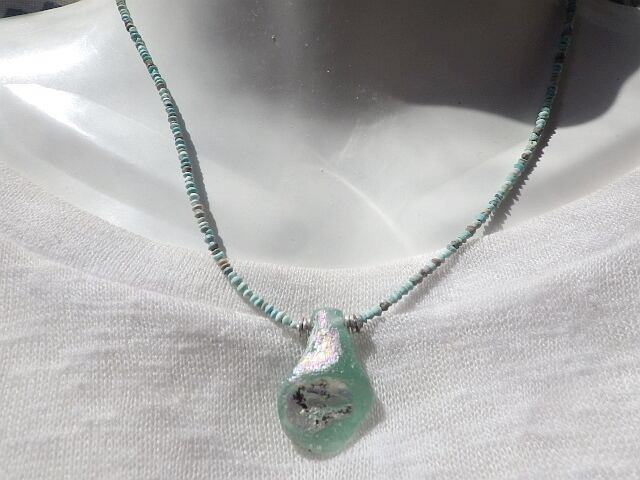 トルコ石はアフガニスタン産で手作業で極少ビーズにされたものを使用しました。ナチュラルでビーチィな色あいにはなんとも言えない味があり、ローマングラスを引きたてています。ワイヤーを通すのに苦労するほど、とーっても細かいエキゾチックなターコイズは華奢で繊細でトップの美しいローマングラスに溶け込んだようにヴィンテージのような味わいのある仕上がりになりました