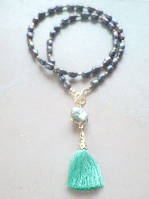 淡水パールのネックレスのトップに、ネックレス部分の淡水パールよりもさらに明るめの美しい淡水パールと鮮やかなエメラルドグリーンのタッセルをマンテル(留め具)に施し、サーフ&ボヘミアンな感じに仕上がりました。真鍮メタルビーズを散りばめ、どころどころにゴールドを効かしてゴージャスさを加味しました。ゴールドにフレーミングされた淡水パールは表も裏もオーロラの光をまとい、とっても美しいですよ