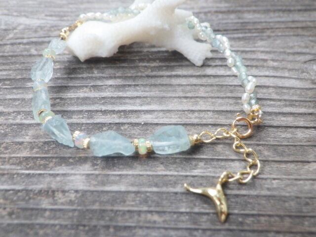 ブレスレットの半分に、アクアマリンのラフロックに遊色の美しいエチオピア産オパールを散りばめ、