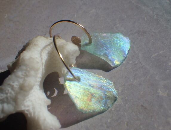 人魚の鱗のような古代ローマングラスが耳元で煌めく、14kgfフープ、又は渦巻きフックピアスです