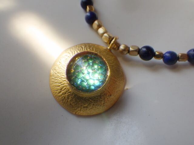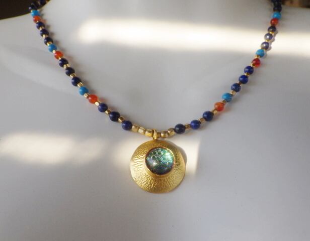 ゴールドのビーズでアクセントをつけました。ネックレス部分はラピスラズリとトルコ石、カーネリアンを贅沢に使用しました