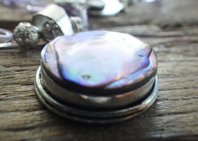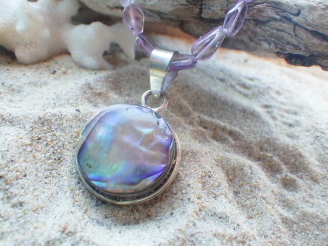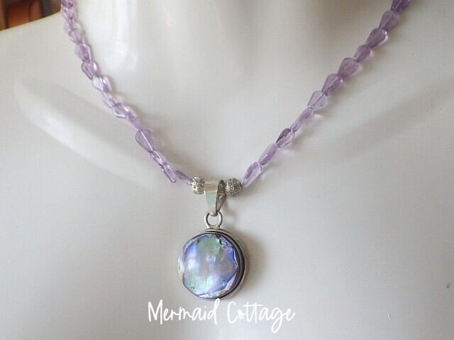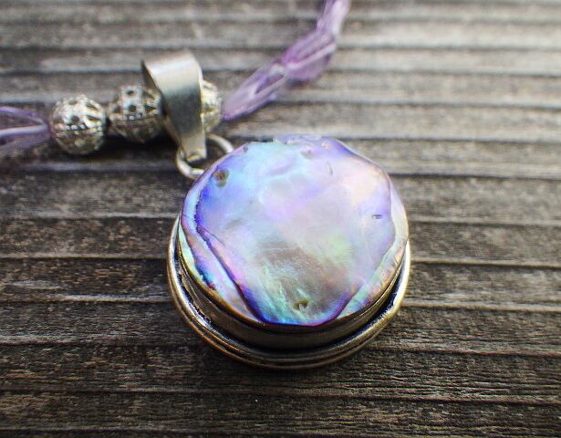 とーっても美しい玉虫色に輝くアバロン(アワビ貝)とアメジストのステートメントネックレスです