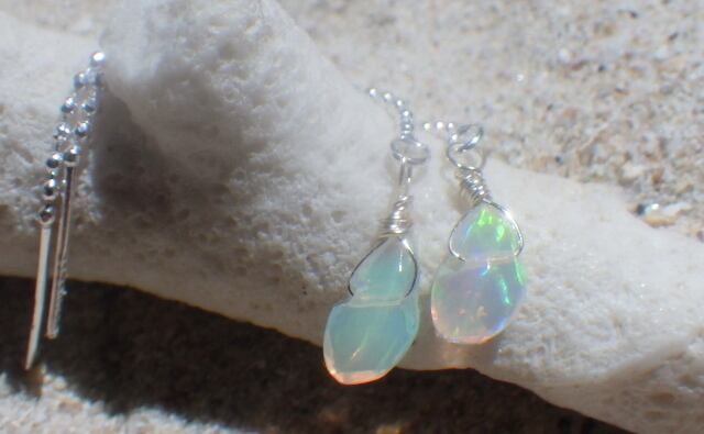 とっても美しいエチオピア産ウェロオパールが耳朶からこぼれ落ちる