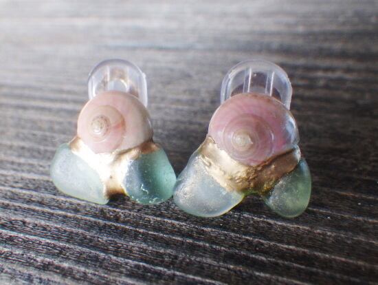 Sea Gift サーモンピンクのうず巻きシェルとシーグラスの金継ぎイヤリング☆蝶バネ