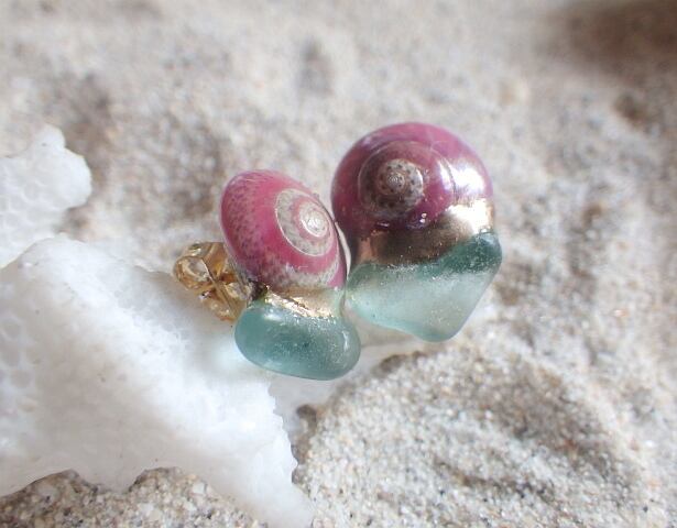 ピンクのうず巻きシェルとシーグラスの金継ぎピアス
