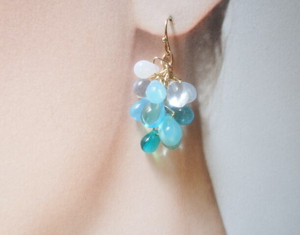 葡萄の房のように束ねてカリブ海を思わせるピアスにしました。