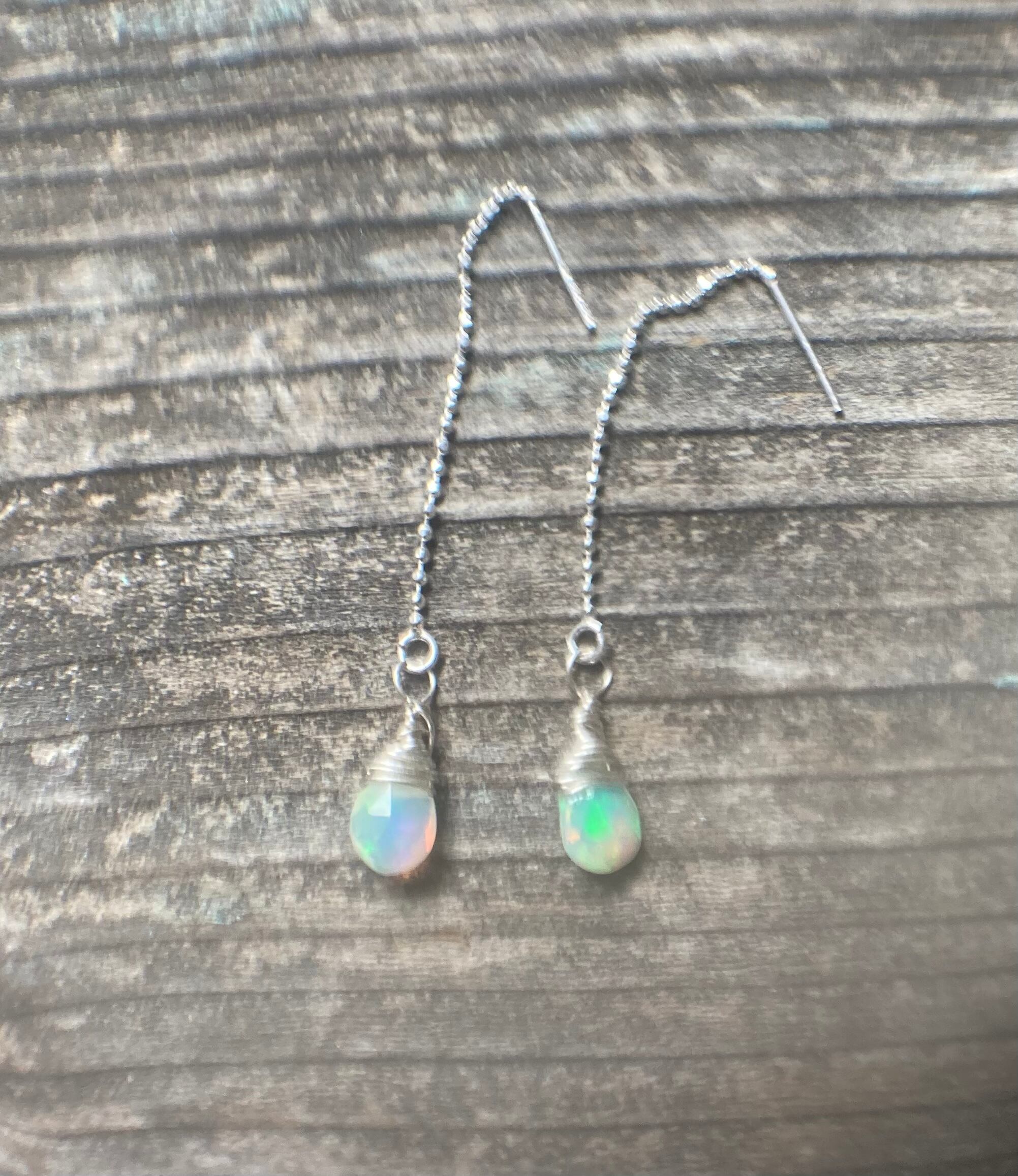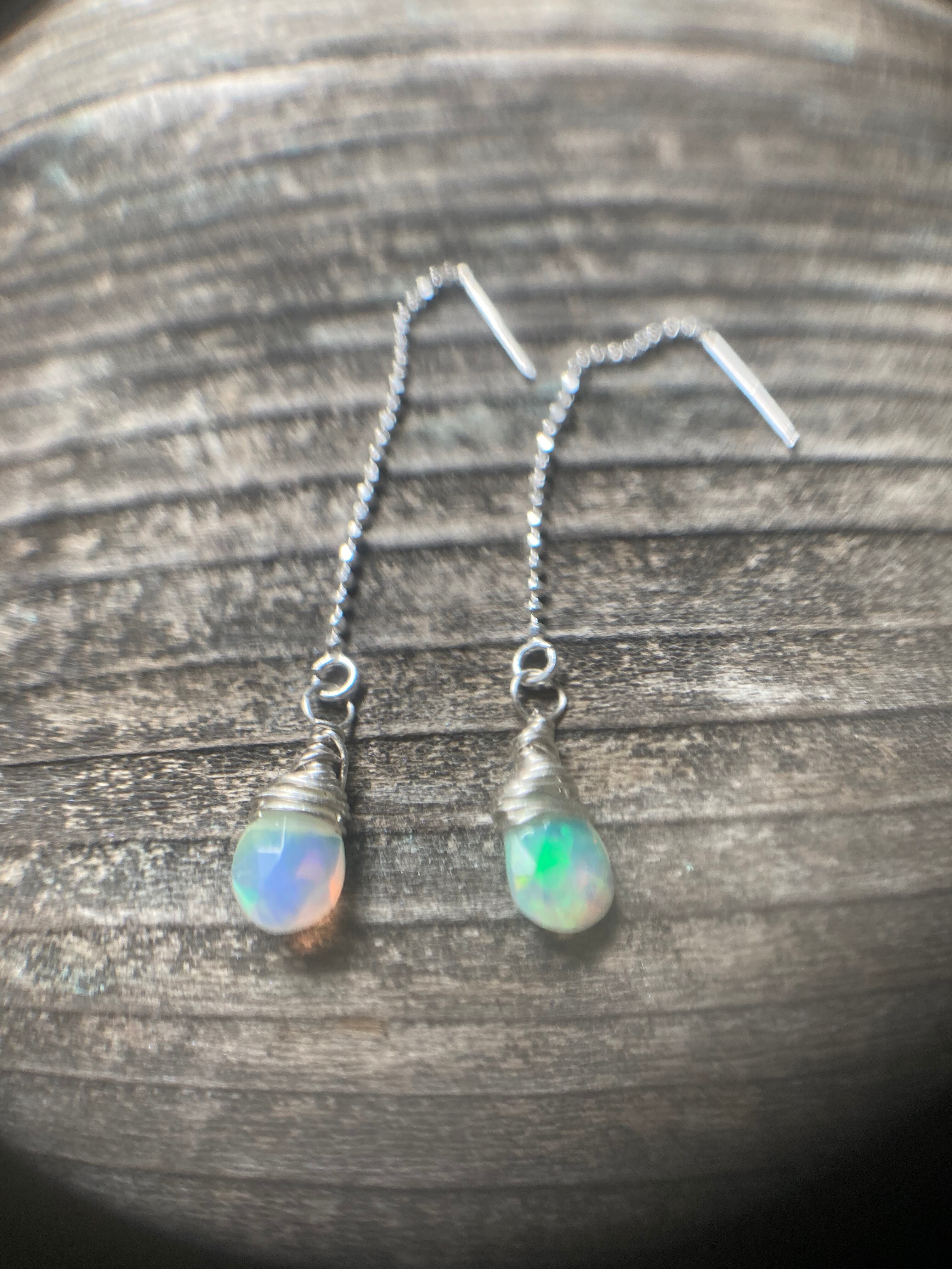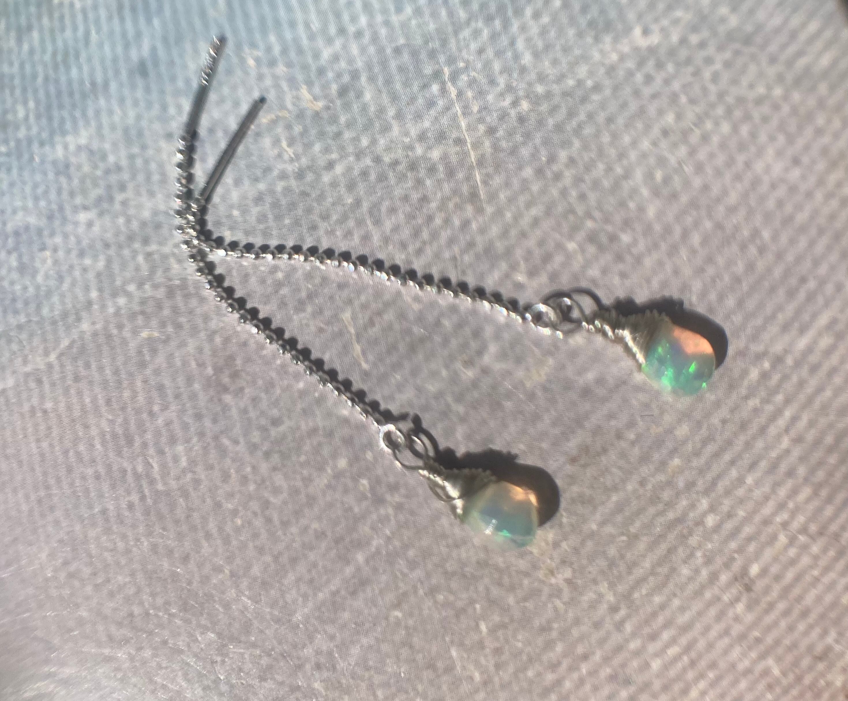 エチオピア産プレシャスオパールをシルバー925ワイヤーで丁寧に包みシルバー925アメリカンピアスのチェーンと一体感を持たせました。美しいカットが施されており、光の当たり具合や角度によって表情が代わり遊色が眩く、マジマジと見てしまいう美しさ♡