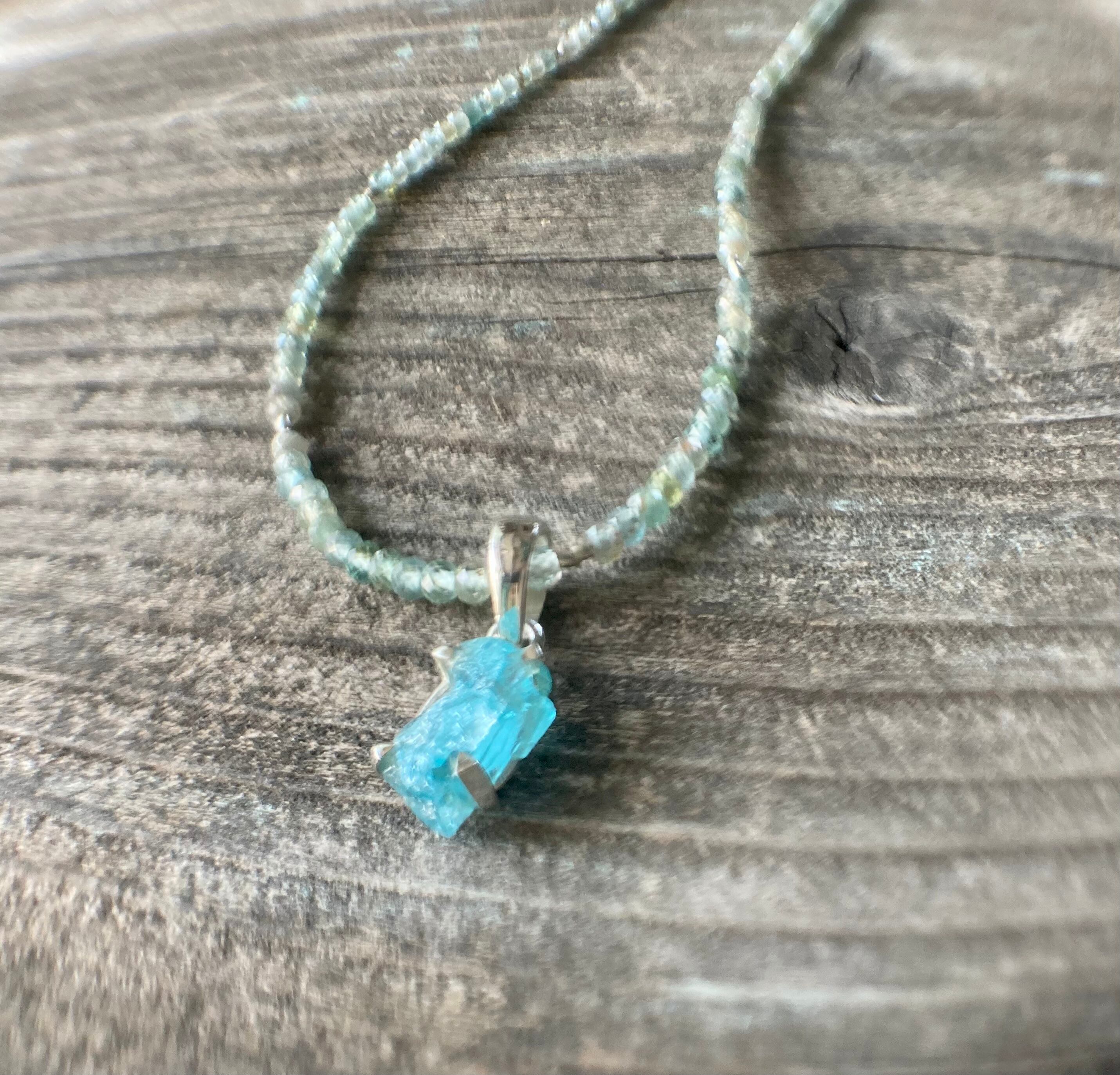 海を切り取ったような美しいブルーのアパタイトのラフロックトップとアパタイトのビーズをふんだんに使用したアパタイトと銀のみのネックレスのご紹介です
