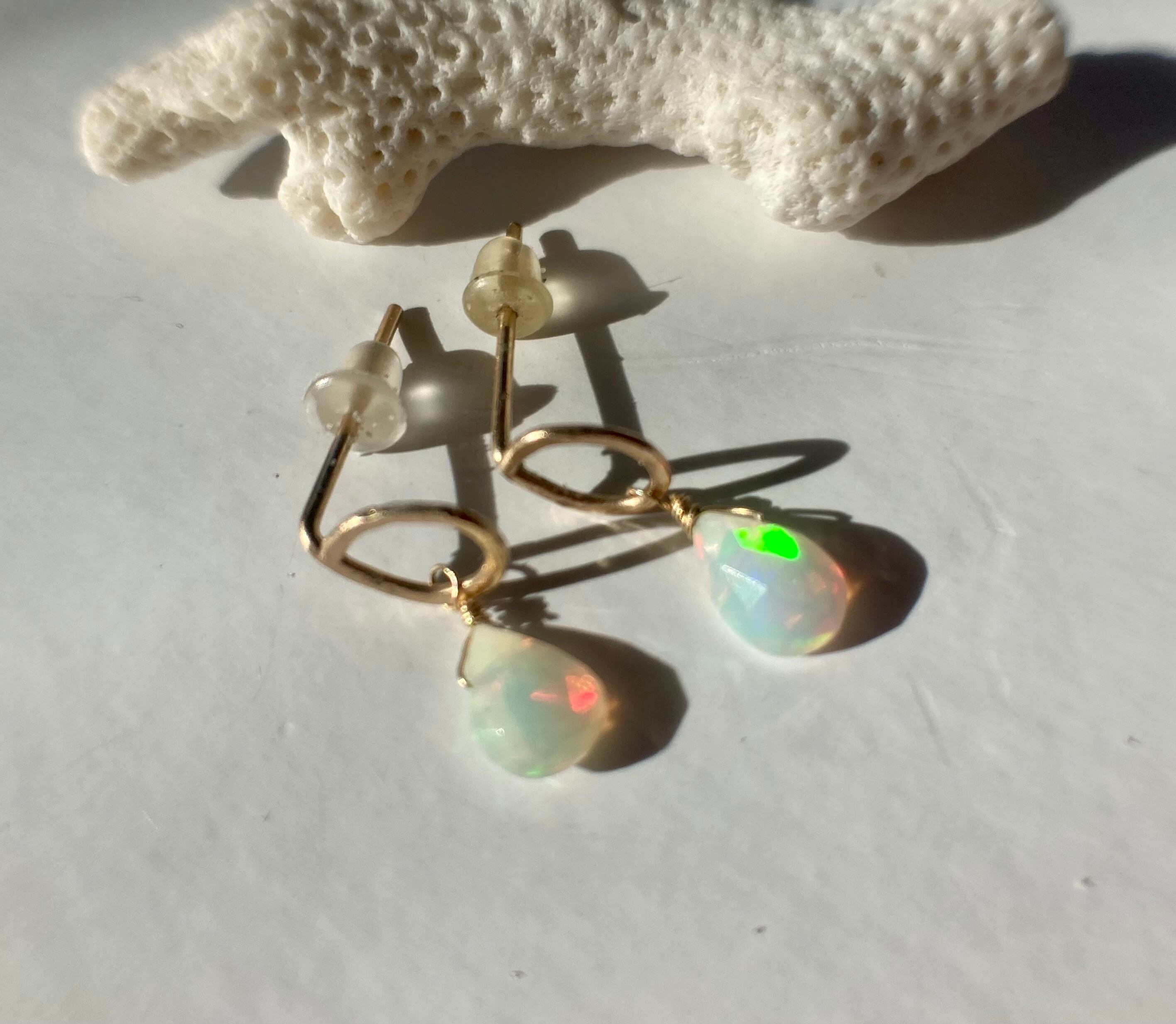 14カラットゴールドフィルドのサークルのスタッドピアスから極上のドロップ型オパールが輝きます