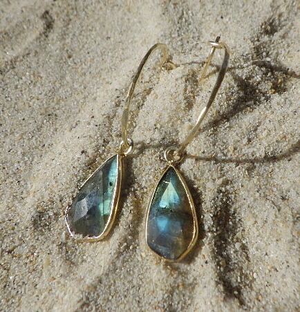 存在感のあるラブラドライトが耳元で妖しく煌めくラグジュアリーなフープピアスです