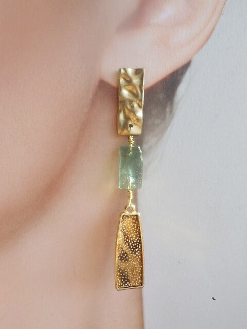 海を思わせるアクア色の長方形ローマングラスとゴールドのドットが素敵なマロンカラーの長方形パーツをあわせ、