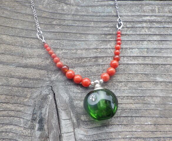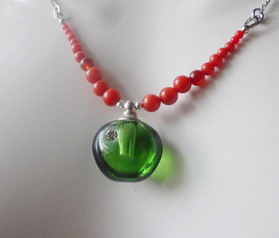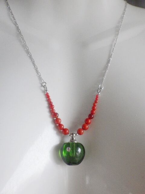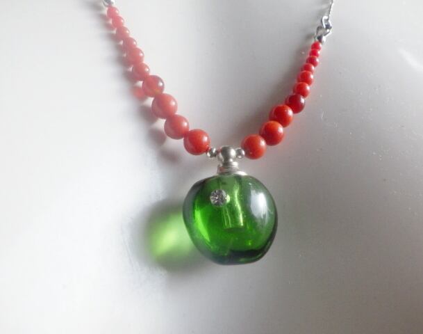 グリーンのボトルに赤い珊瑚でクリスマス気分を盛り上げる可愛いネックレスでお気にいりの香りといつも一緒♪です