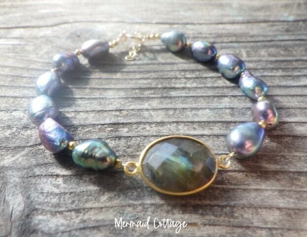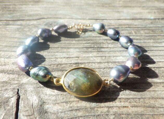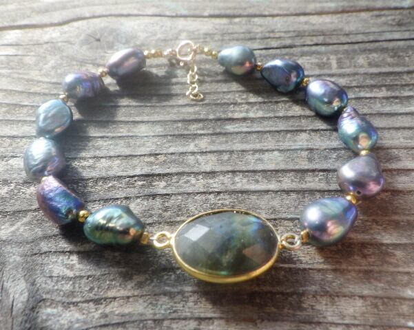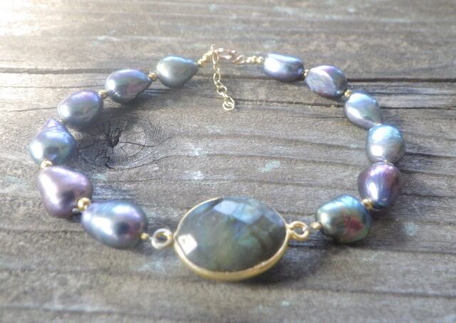 *14kGF*大粒ラブラドライトの淡水パールブレスレット Flesh Pearl