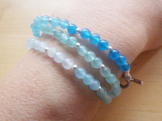 海色のアゲートやガラスビーズをグラデーションにしてつないだ海グラデーションネックレスは写真の様にグルグルっと腕に巻いて3連のゴージャスなブレスレットにもなる嬉しい2WAY!留め具はトグルなので装着が楽々です^^