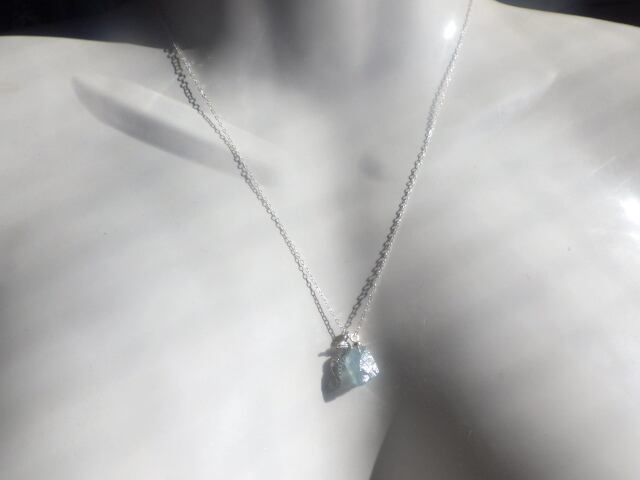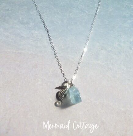 可愛らしい銀製のタツノオトシゴとモチーフと海にとても深いかかわりを持った石、美しいアクアマリンのラフロックを添えて、
