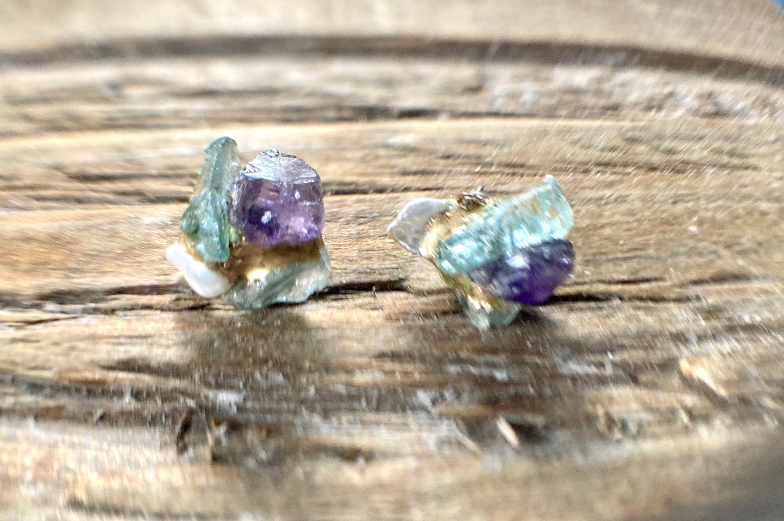 天然石のナチュラルな形をそのまま活かした原石の小さな金継ぎピアスです