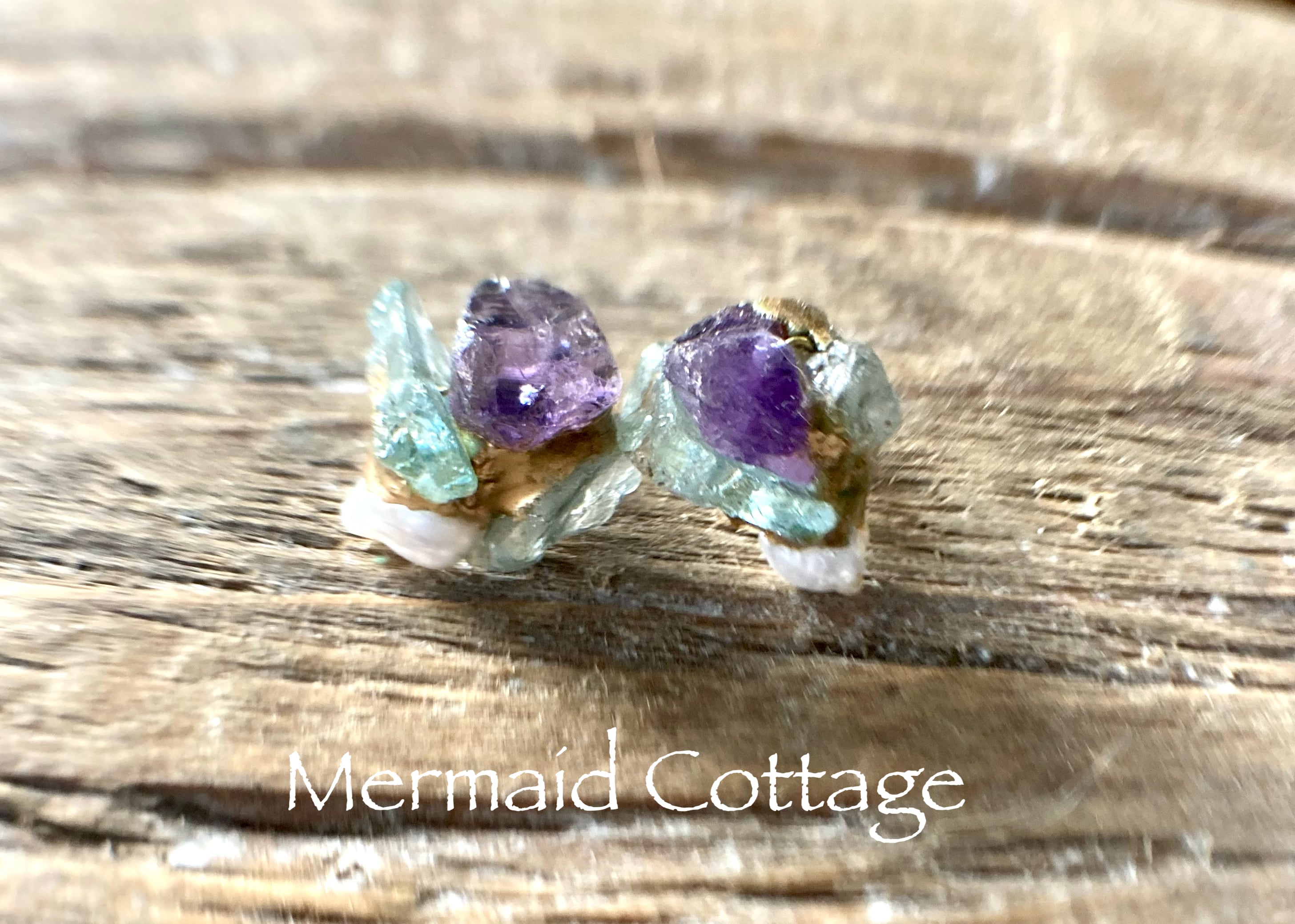 3月誕生石☆Raw Amethyst &Aquamarine 原石の金継ぎピアスII☆アメジスト&アクアマリン&パール☆チタンポスト