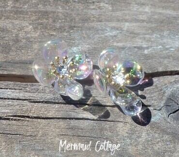 とても綺麗なオーロラ色のお花から 朝露の滴が滴り落ちる瞬間を固め、フェミニンなスタッドイヤリングにしました